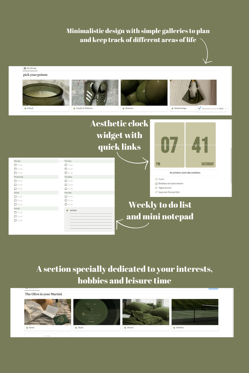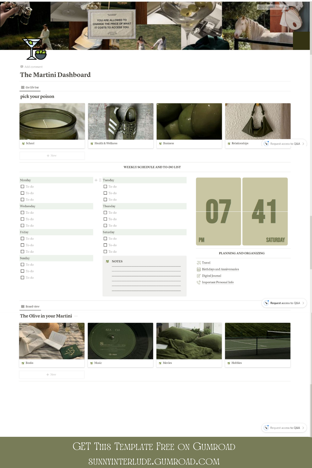 The next section is dedicated to plan your days quickly and efficiently. The weekly to-do list is laid for easy use with a mini notepad like callout to help you write down thoughts and reminders. To the side of it is a widget clock whoe link will be included in the quick links below it. These quick were extra areas of life to consider when staying organized Each gallery section for both galleries have a simple layout to get you started on keeping track and planning effectively. If you have any questions feel free to email me at @sunnyinterlude.gmail.com - I take customizations too :) Pinterest Instagram
